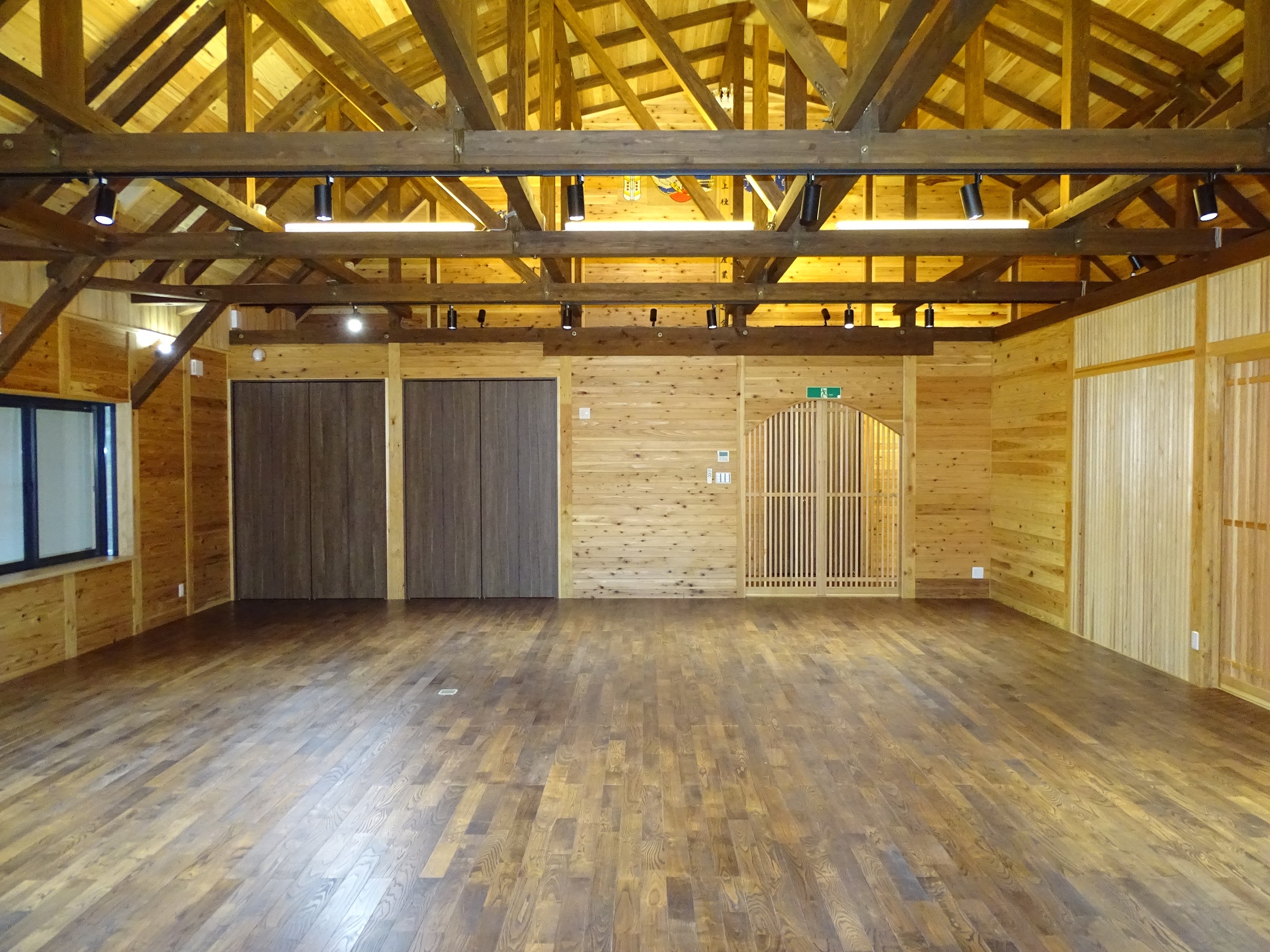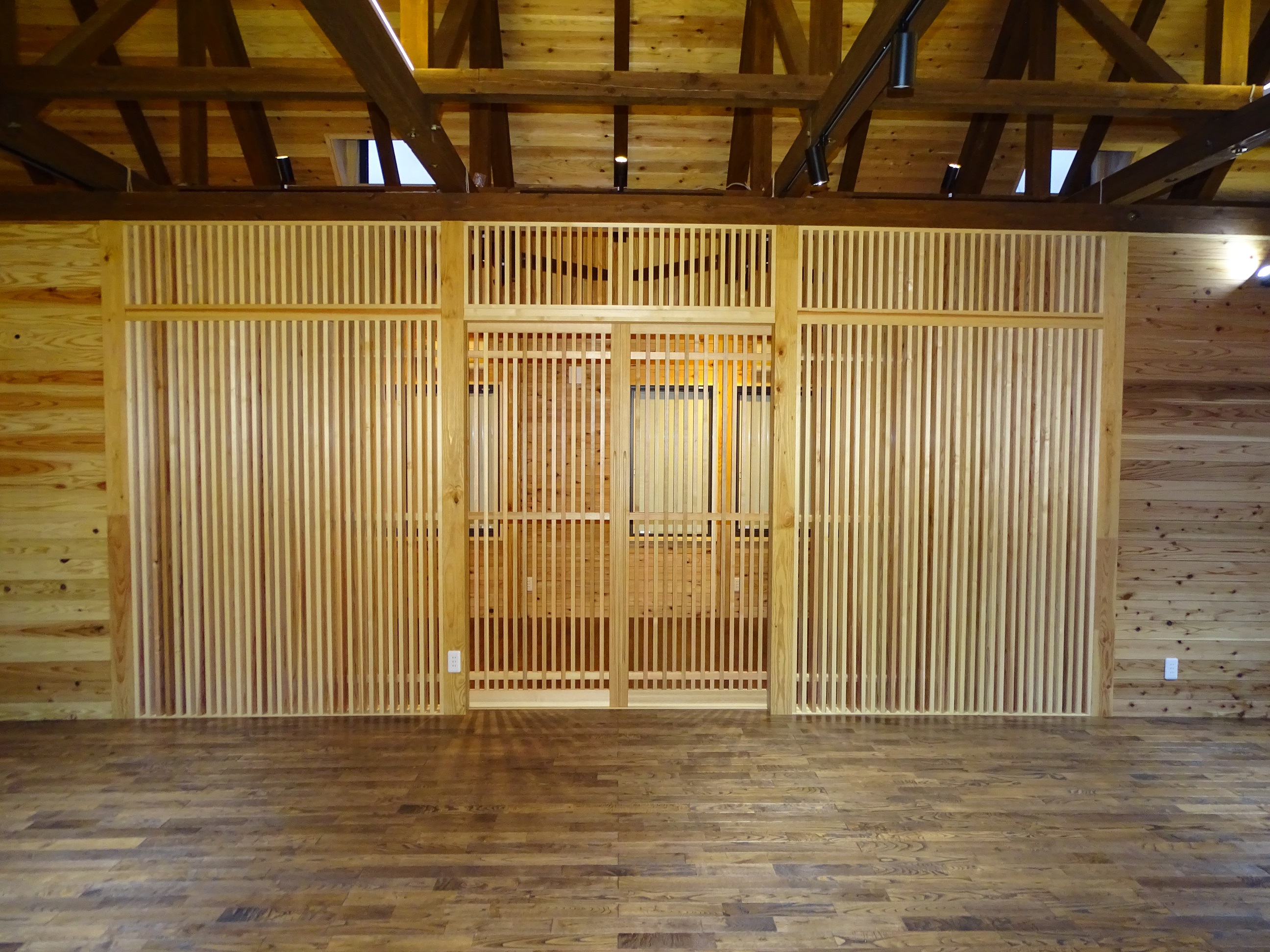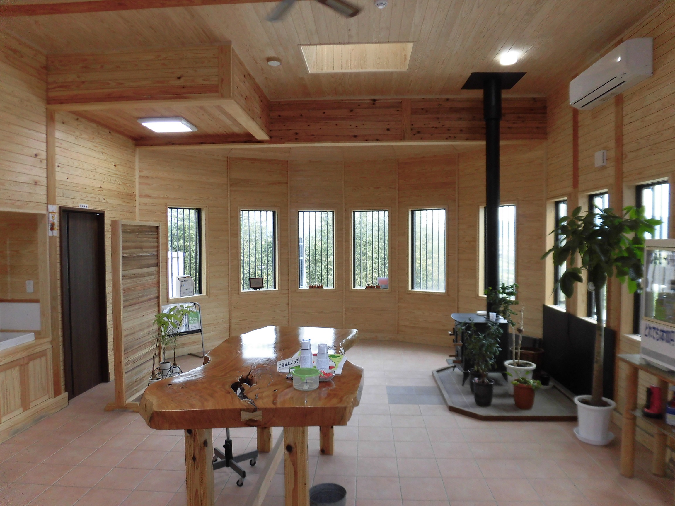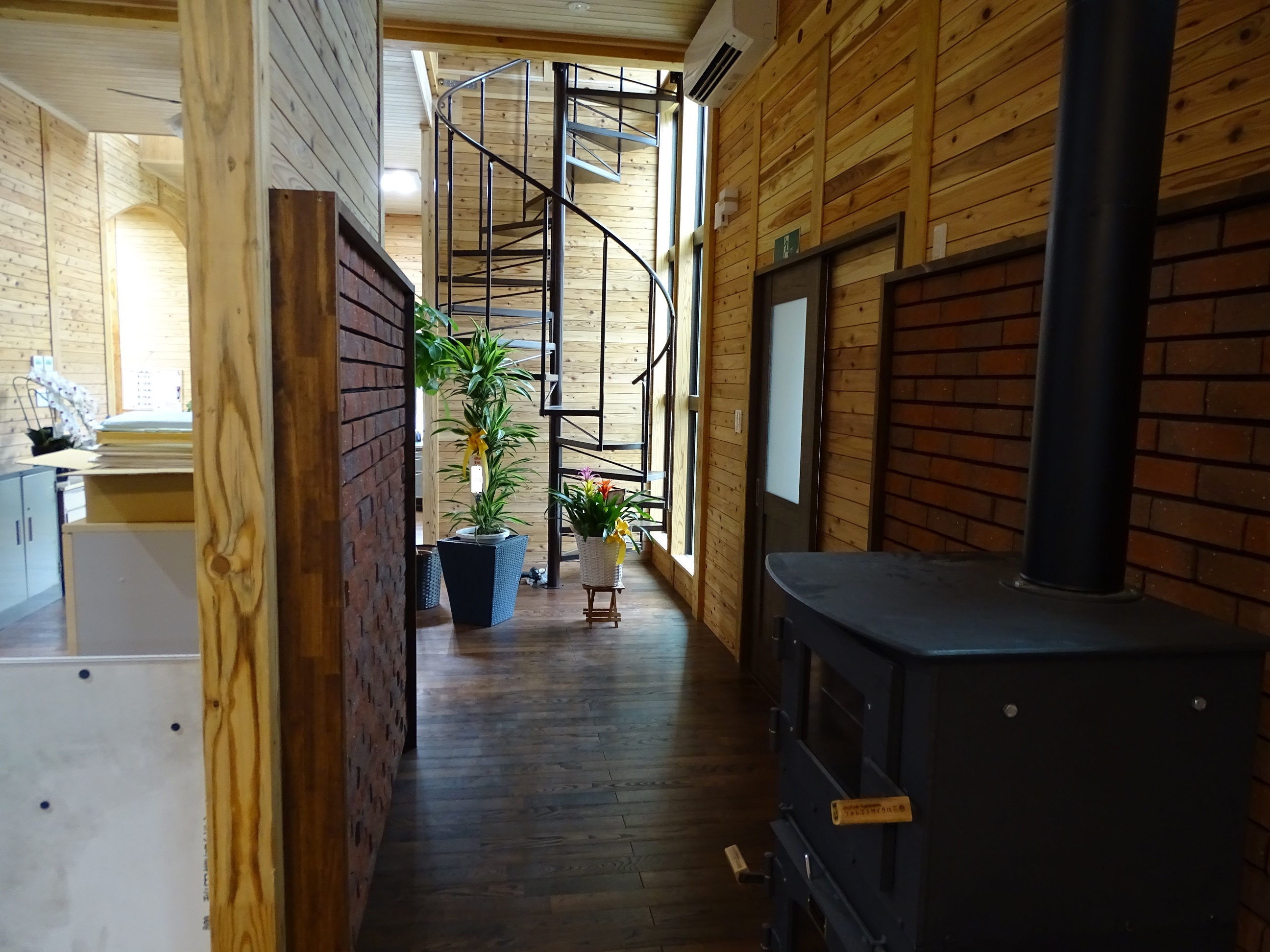 薪ストーブ3台で事務所の暖房をとっています。内部壁面は板倉工法による杉板30㎜の化粧板が特徴。天井は40㎜の杉板による表し工法。これらは天然の断熱材なのです。