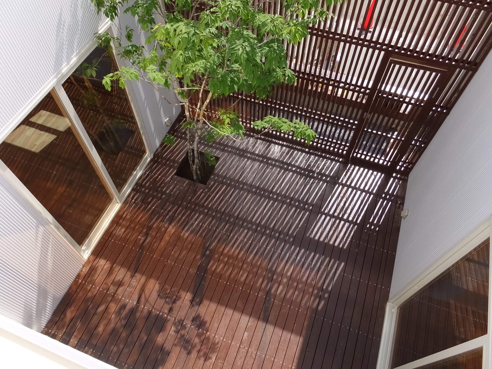 リビング前にある中庭は縦格子の板塀が外部からの視線を調整しプライバシーを守りつつ日当たりの良い空間になっています。